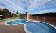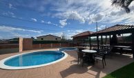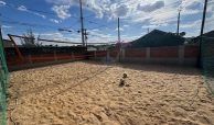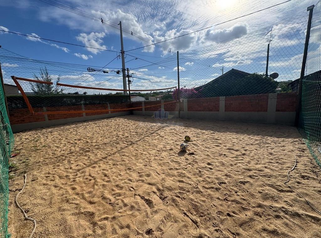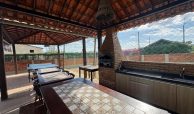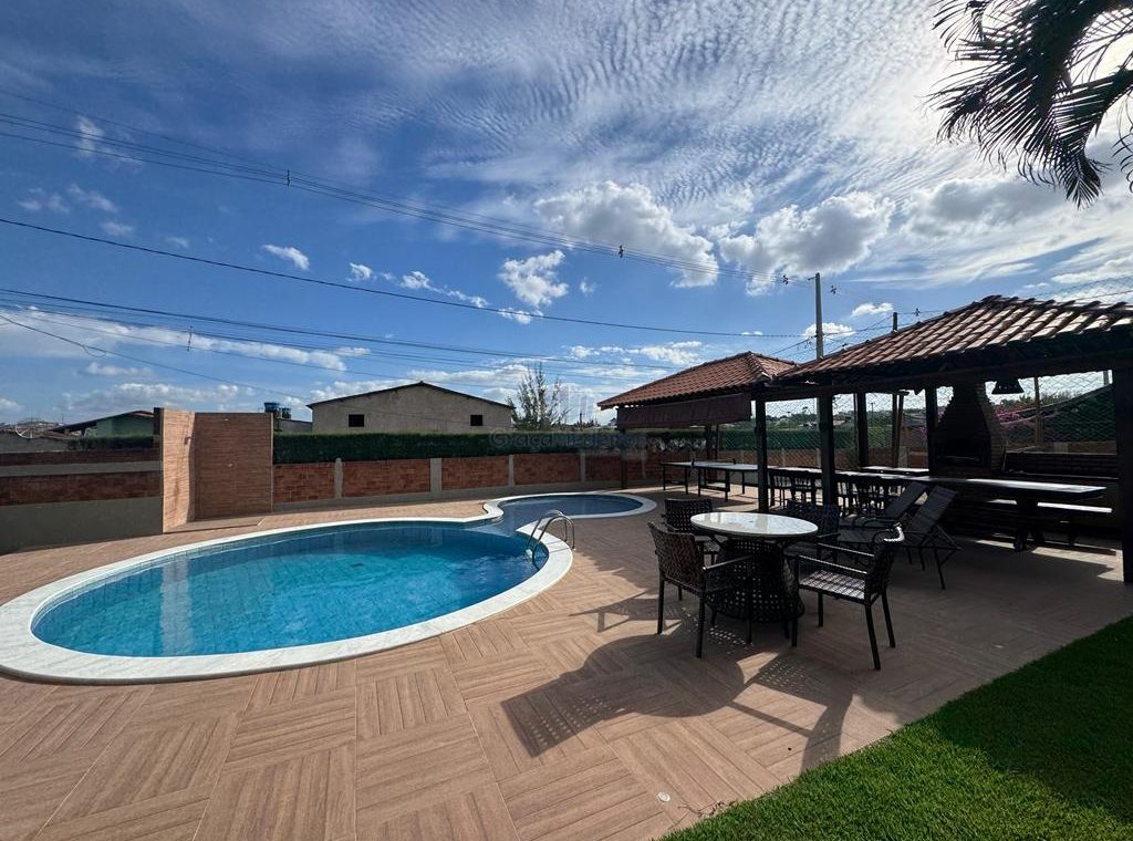 Área de lazer com piscina adulto e infantil, salão de festas com área gourmet e campo.