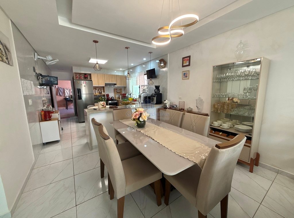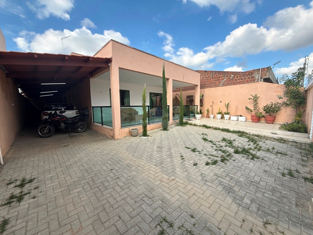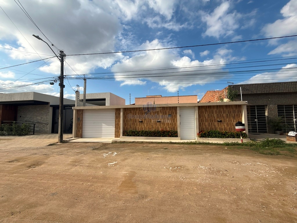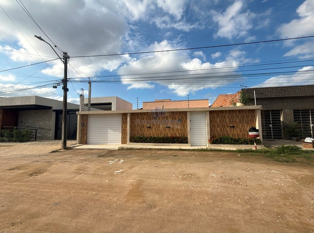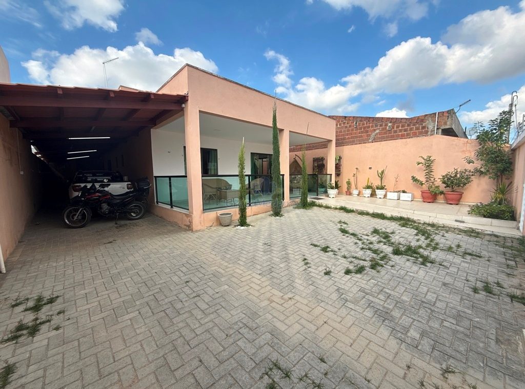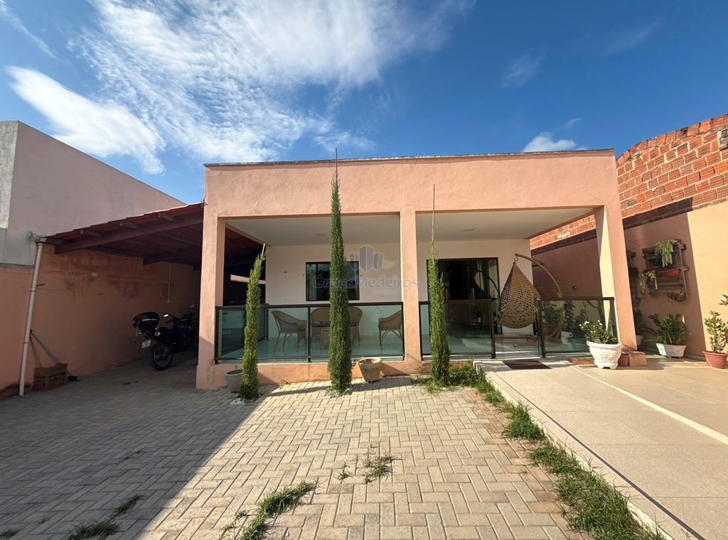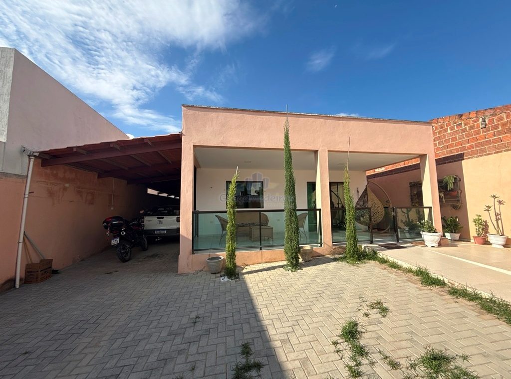 Casa fora de condomínio, com três quartos sendo uma suíte e WC social, com 4 anos de construída em terreno 15×25, garagem coberta para 4 carros, laterais livres, Sala para dois ambientes e cozinha estilo americana, despensa, quintal coberto com área de serviço e WC externo, 115 m² de área construída.
