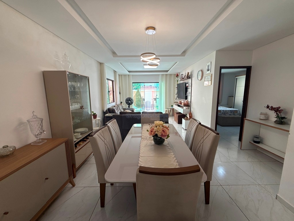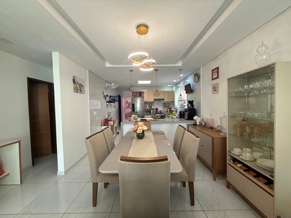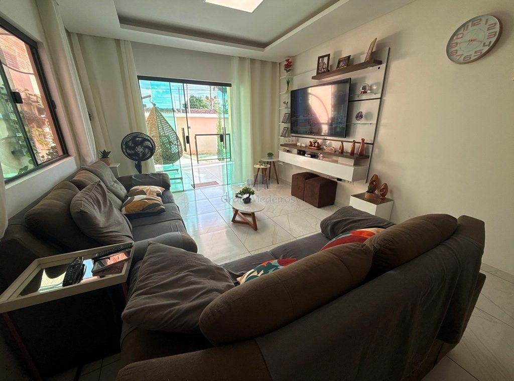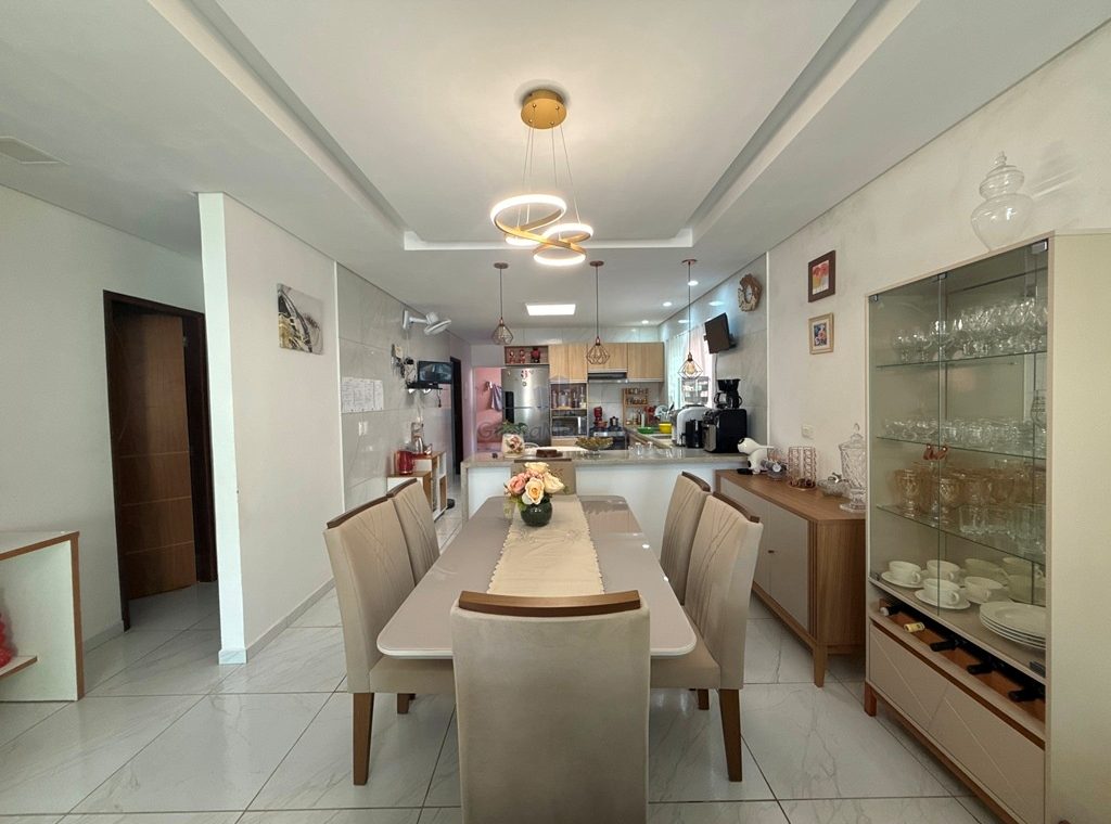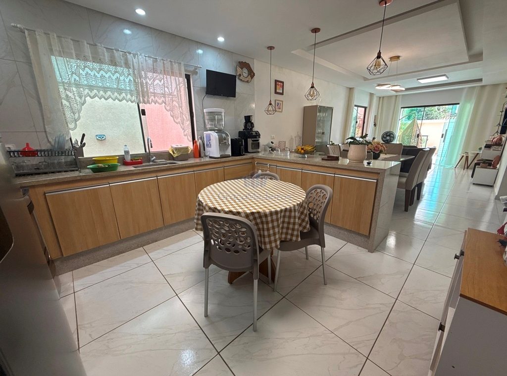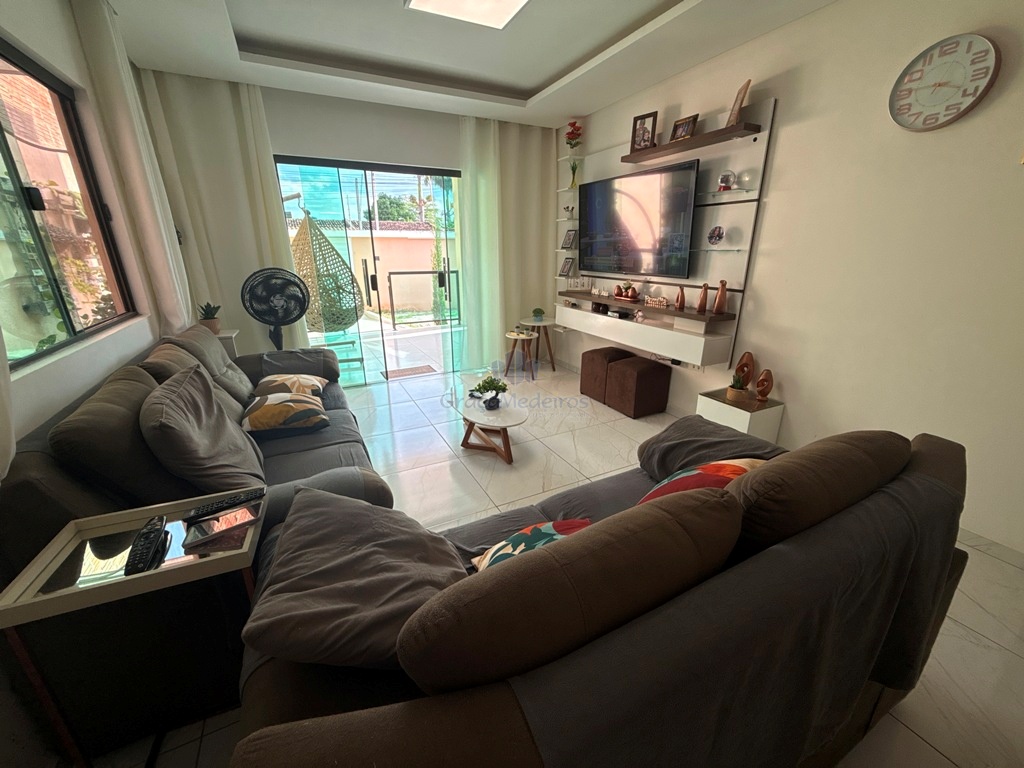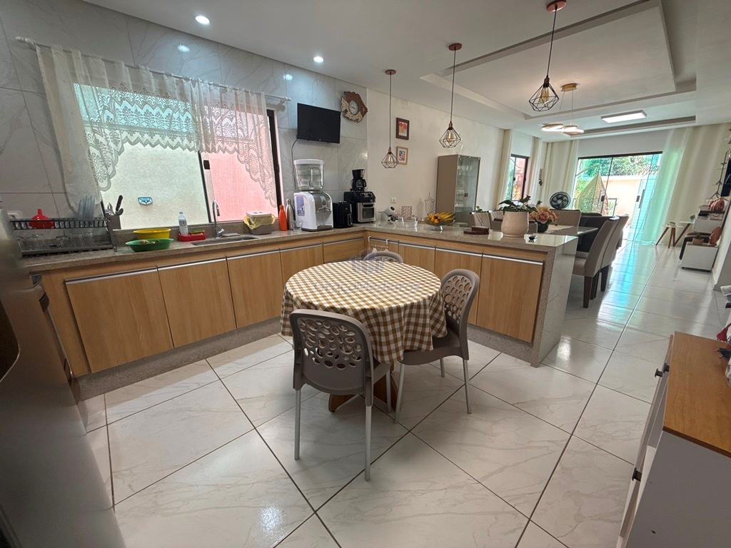 Casa fora de condomínio, com três quartos sendo uma suíte e WC social, com 4 anos de construída em terreno 15×25, garagem coberta para 4 carros, laterais livres, Sala para dois ambientes e cozinha estilo americana, despensa, quintal coberto com área de serviço e WC externo, 115 m² de área construída.